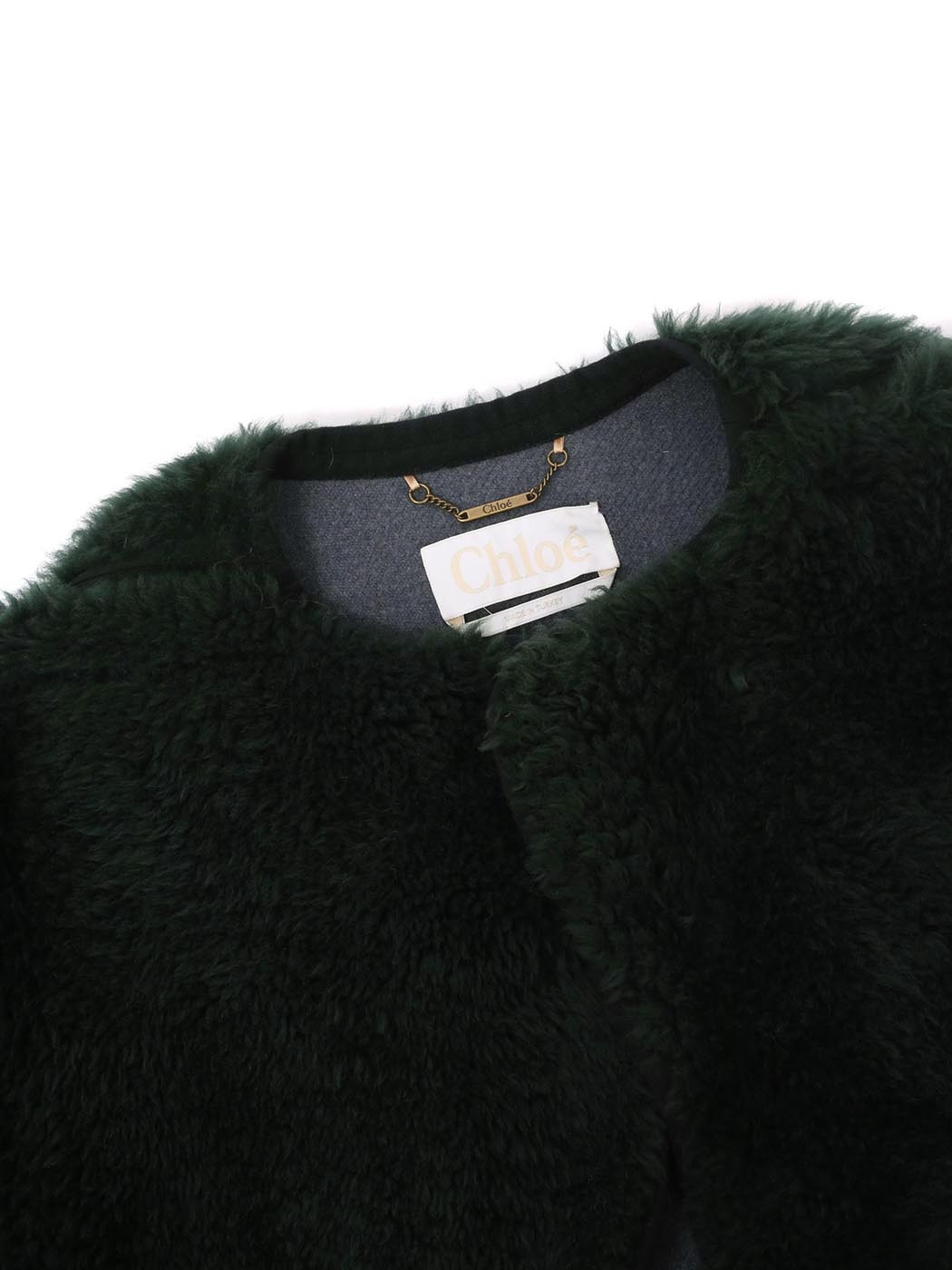 Chloé's Fall '16 collection was inspired by Anne-France Dautheville, the first woman to travel across the world on a motorbike in the 'os. Crafted from plush shearling in a rich forest-green hue, this glamorous piece is finished with ribbed trims that help to define its luxurious volume.