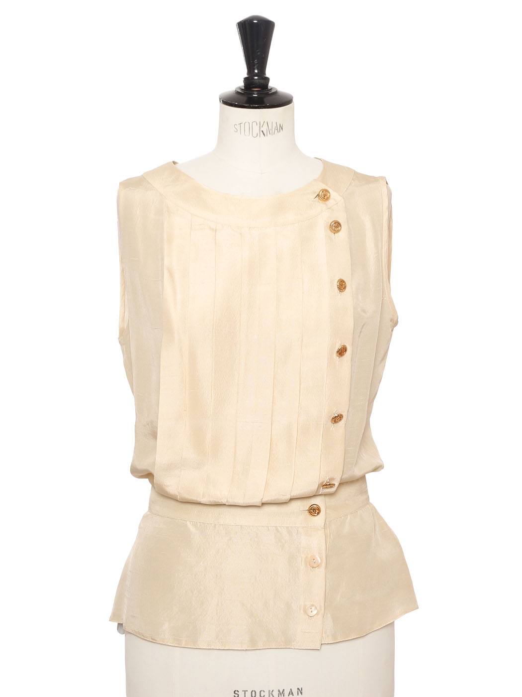 Cream white silk sleeveless top with gold jewelry button Retail price 3200€ Size XS