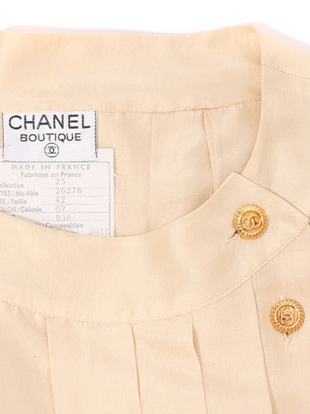 Gold brass buttons engraved with the Chanel logo.