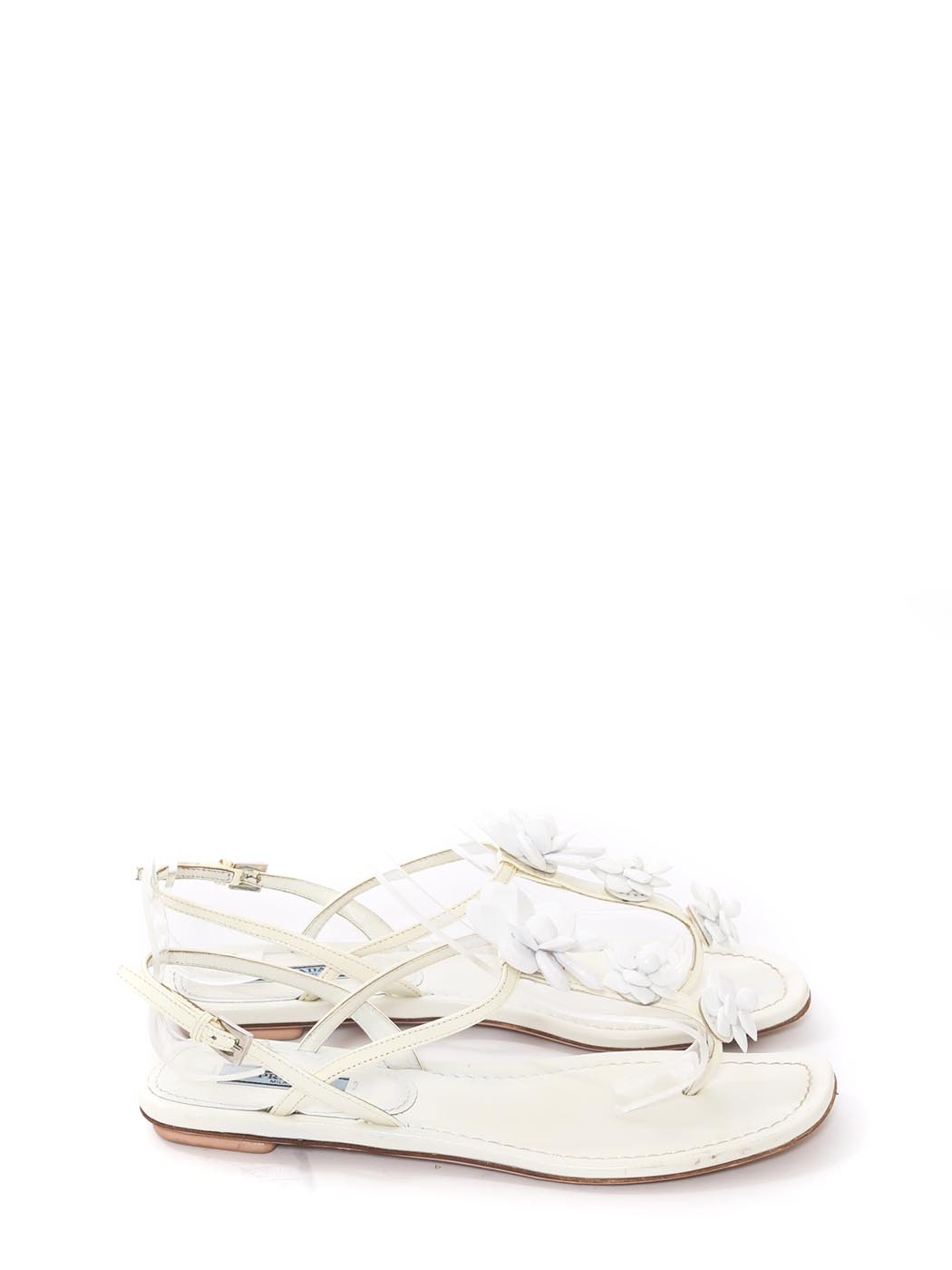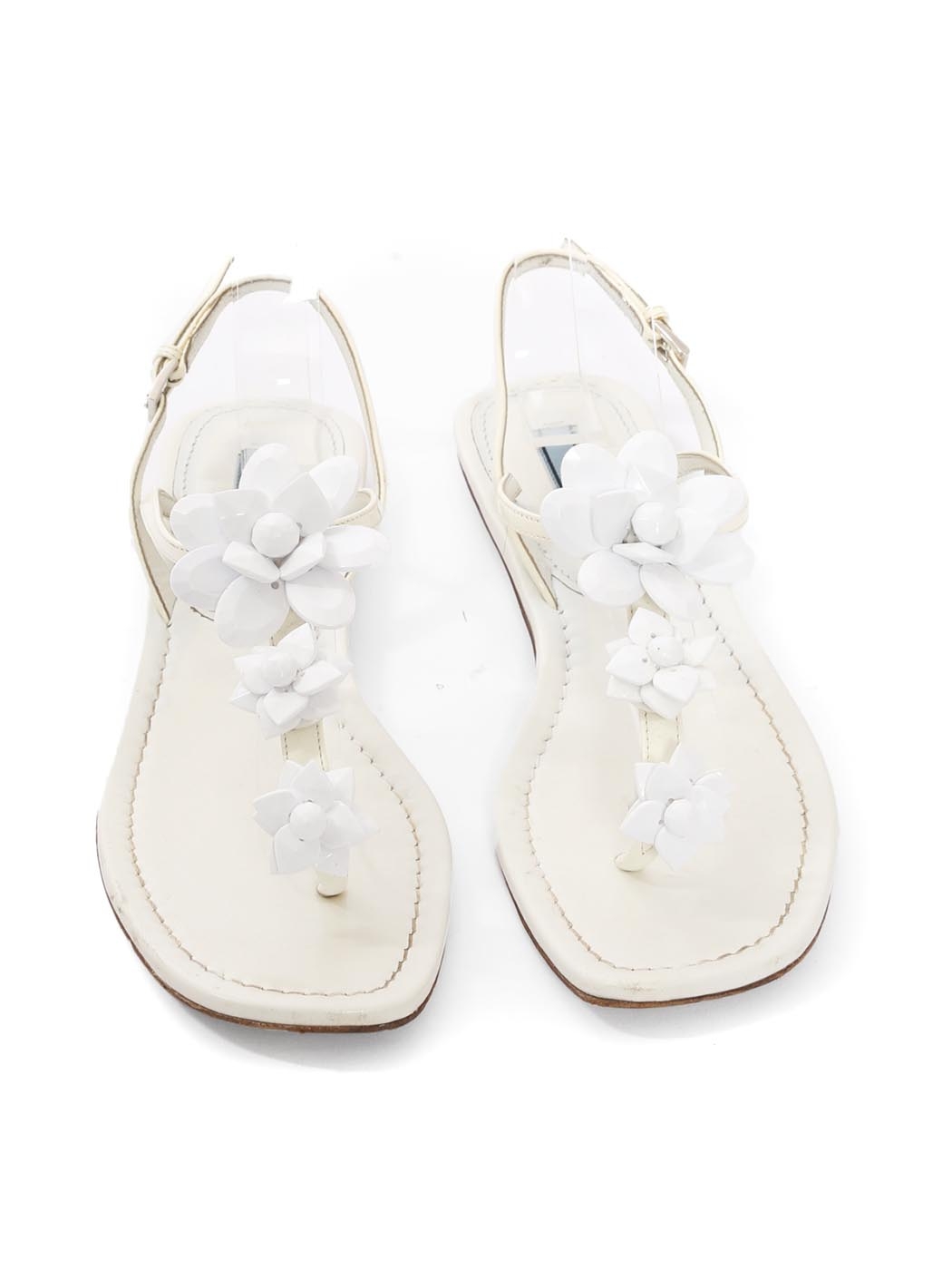Sandales plates en cuir verni blanc ornées de fleurs en acétate Prix boutique 800€ Taille 38