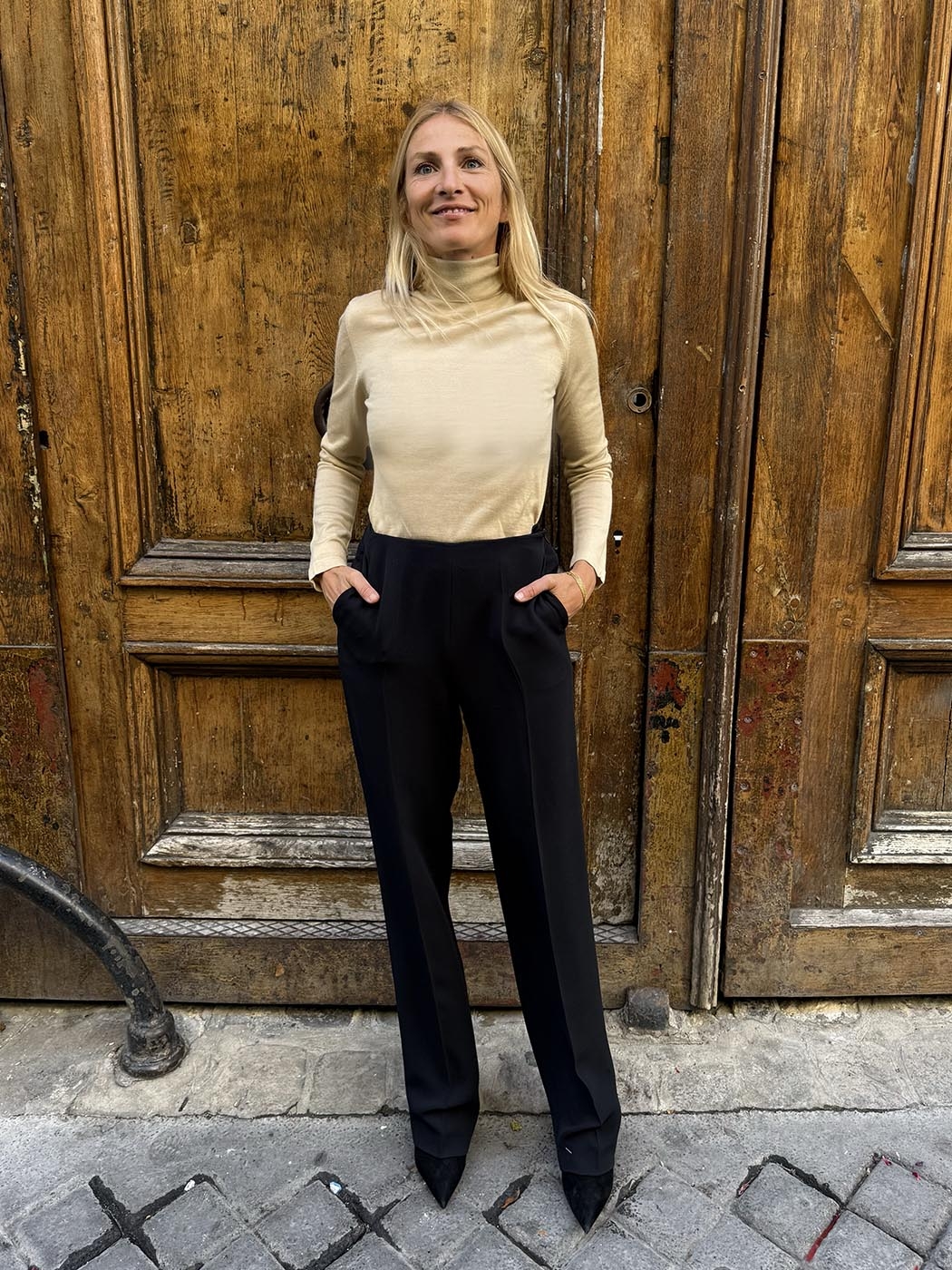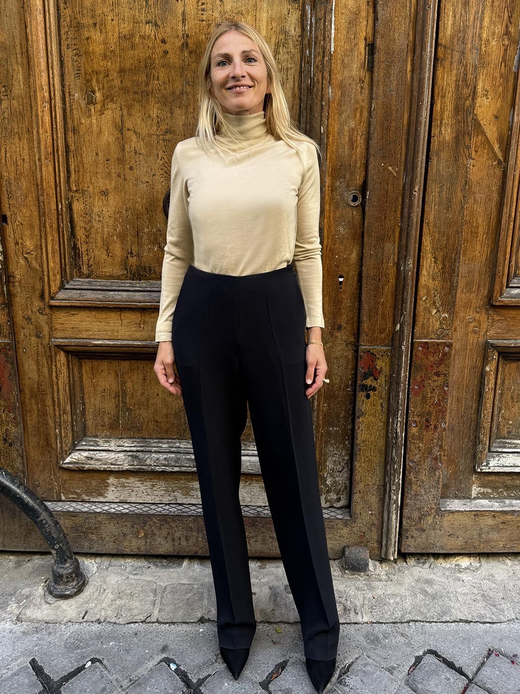 Taillé à la perfection dans une luxueuse soie fluide et douce, ce pantalon est une pièce classique, très élégante. Sa coupe impeccable et sa couleur noire en font une pièce intemporelle et incontournable qui restera des années un essentiel de votre garde-robe.
