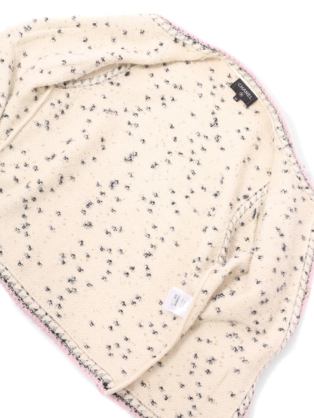 Impeccablement coupée dans un luxueuse laine et cachemire, cette veste est une petite merveille de la Couture française, une pièce classique et iconique de la Maison Chanel. D'une douce teinte blanche, lilas, dorée et noire, elle est lumineuse. Cette veste habillera avec élégance toutes vos tenues. Portez-la avec un pantalon évasé et de hauts talons ou avec des ballerines plates et un jean dans l'esprit de la Maison Chanel.