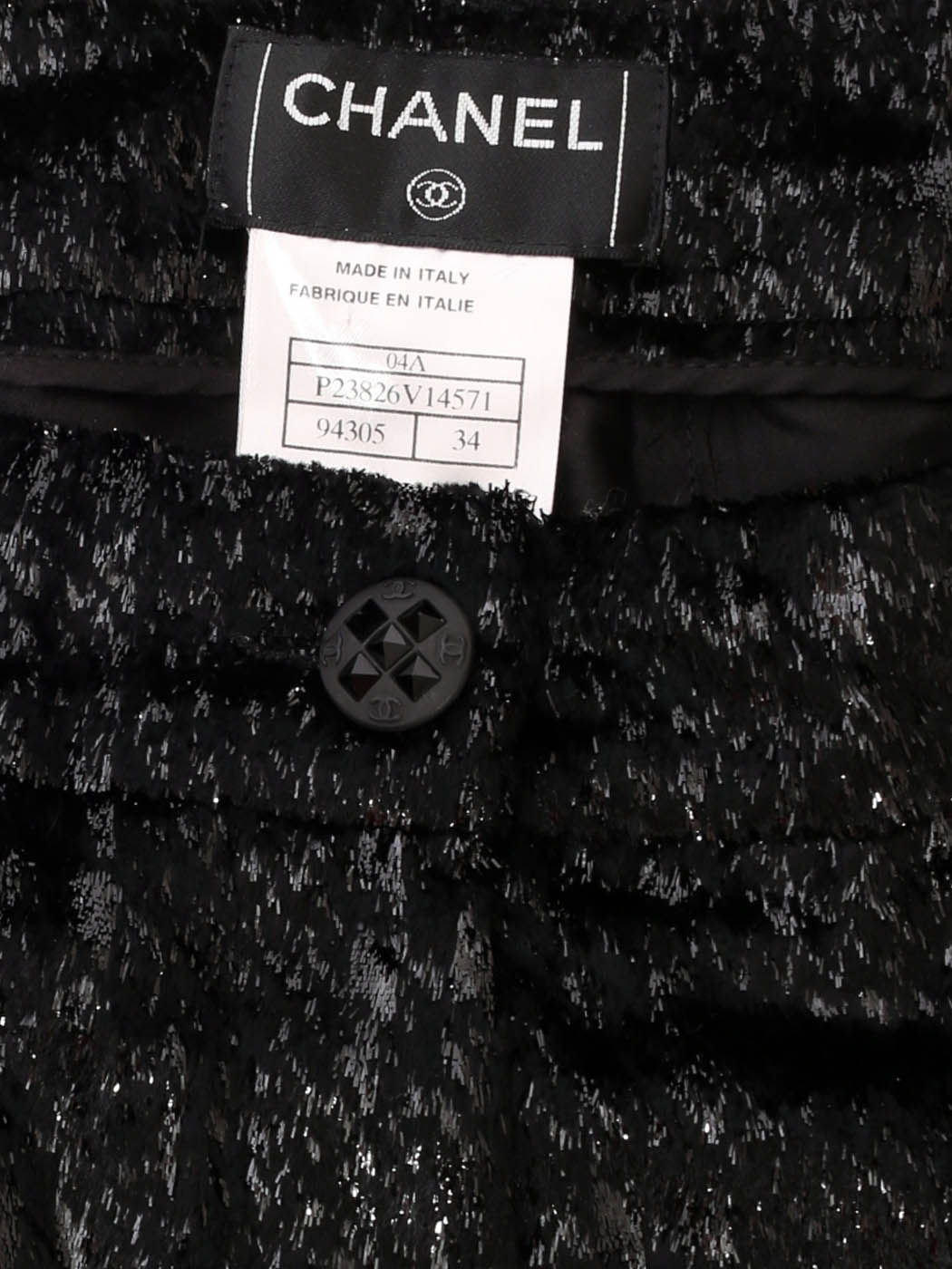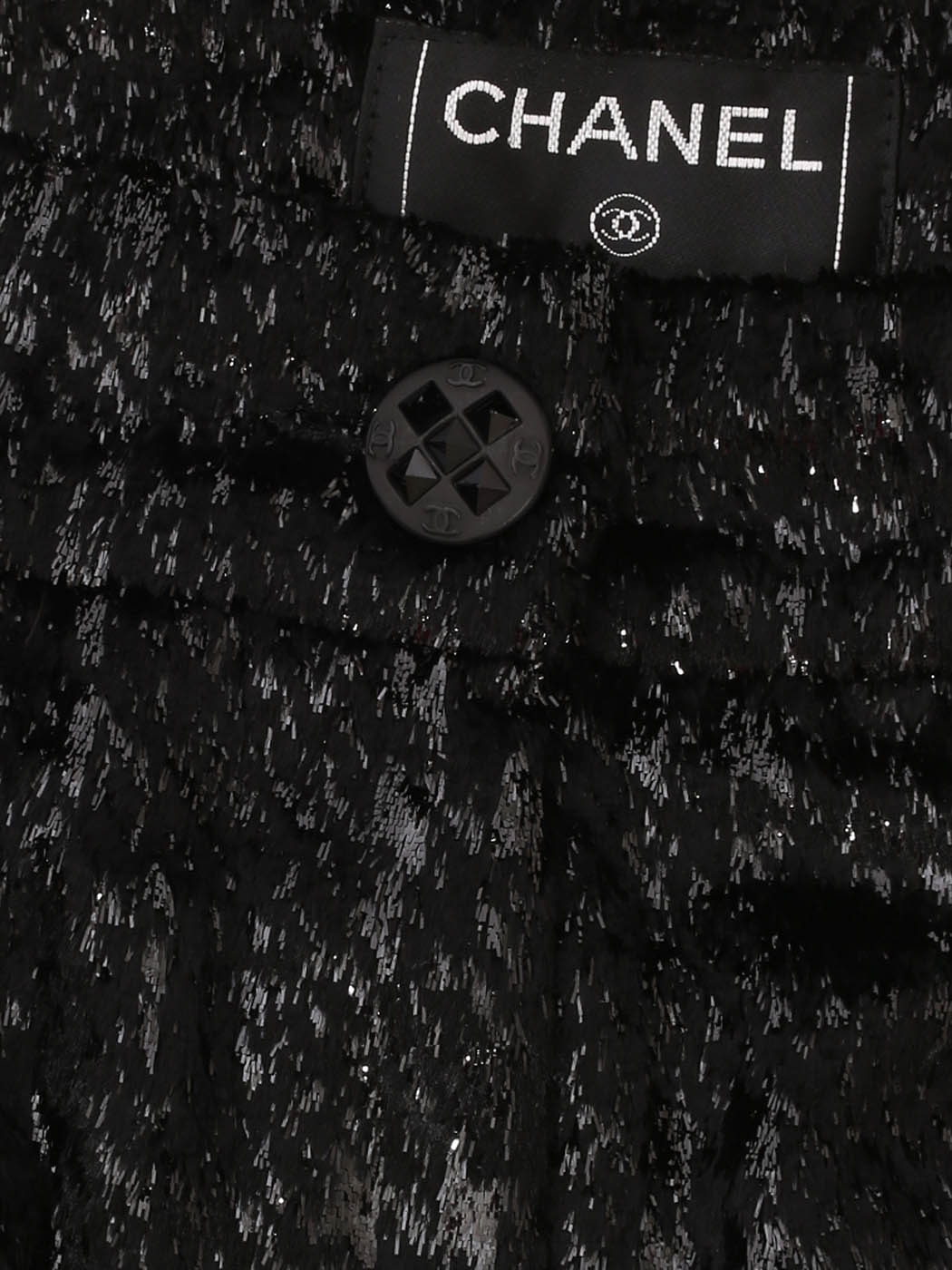 Fermeture éclair, bouton bijoux noir gravé sigle CC entrecroisé.