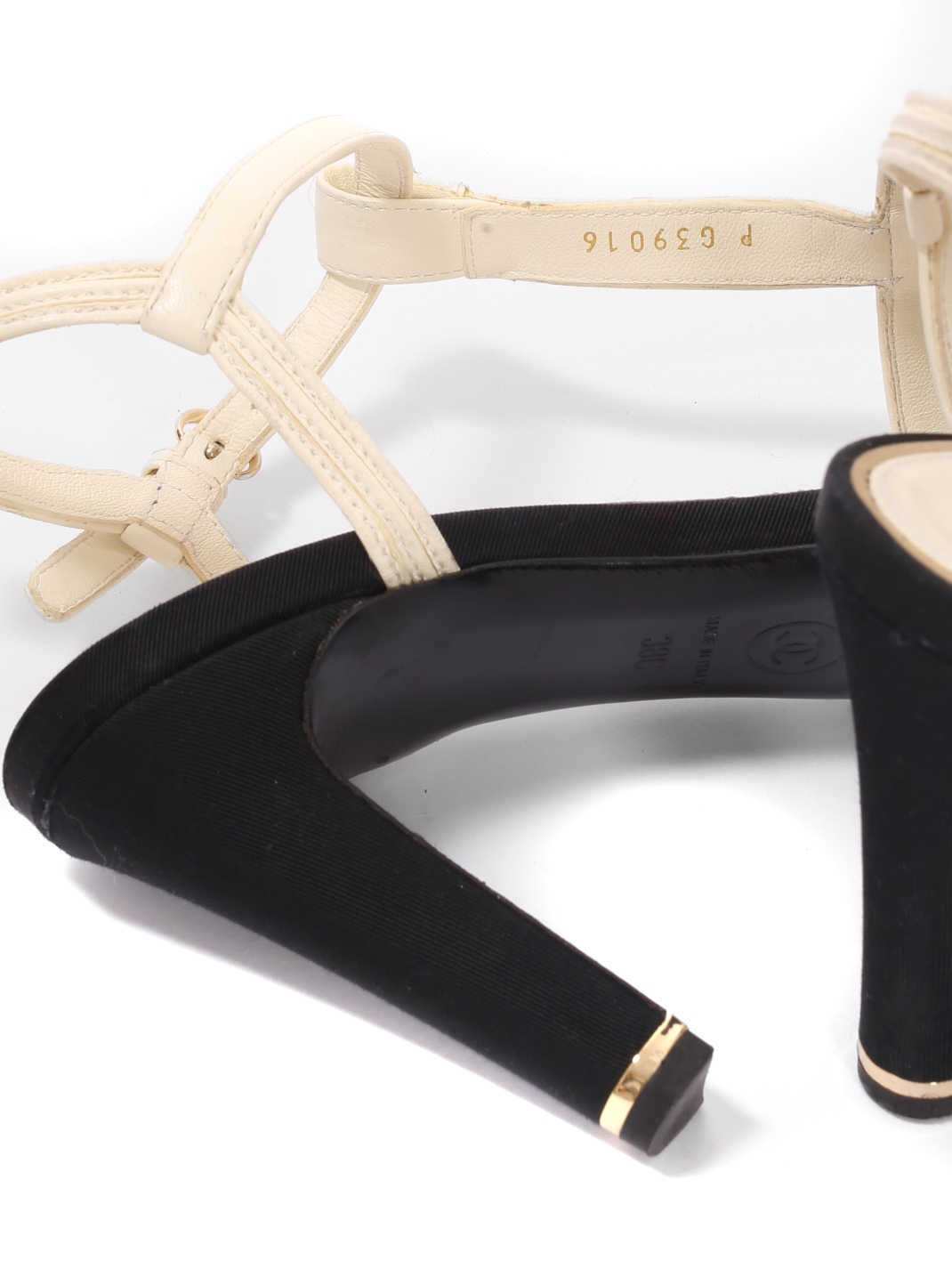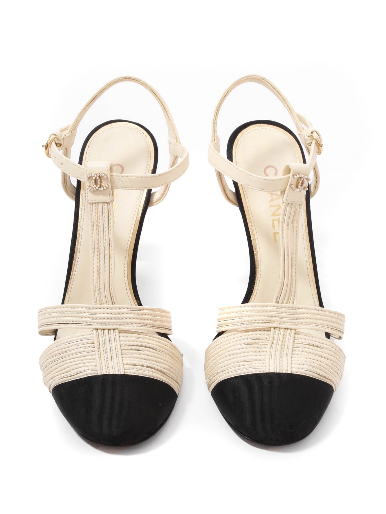 Escarpins T bar en cuir blanc crème gros grain noir et sigle CC perle Prix boutique 1200€ Taille 38